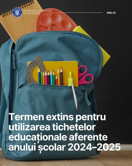 Ministerul Investițiilor și Proiectelor Europene (MIPE), împreună cu Ministerul Educației și Cercetării, a anunțat prelungirea până la data de 31 octombrie 2025 a perioadei în care pot fi utilizate sumele aferente tichetelor educaționale pe suport electronic, în valoare de 500 de lei, acordate elevilor din medii defavorizate pentru anul școlar 2024–2025.