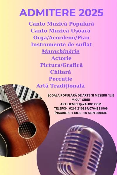 Școala Populară de Arte și Meserii „Ilie Micu” din Sibiu invită copiii, părinții și iubitorii de artă să se înscrie pentru anul școlar 2025–2026, până pe 20 septembrie.